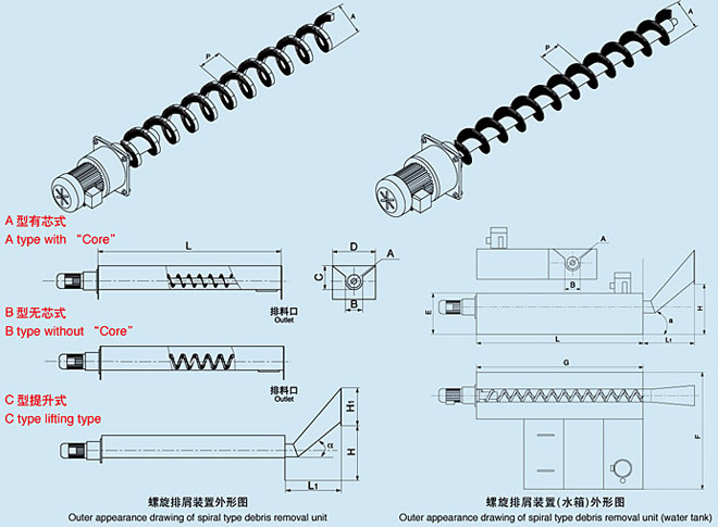 ZDLX系列螺旋排屑裝置是由減速機(jī)、螺旋體及殼體三部分組成。通過(guò)減速機(jī)驅(qū)動(dòng)螺旋體轉(zhuǎn)動(dòng),與殼體產(chǎn)生相對(duì)運(yùn)動(dòng),從而將切屑沿殼體軸向推出。根據(jù)使用情況,結(jié)構(gòu)形式可分為: