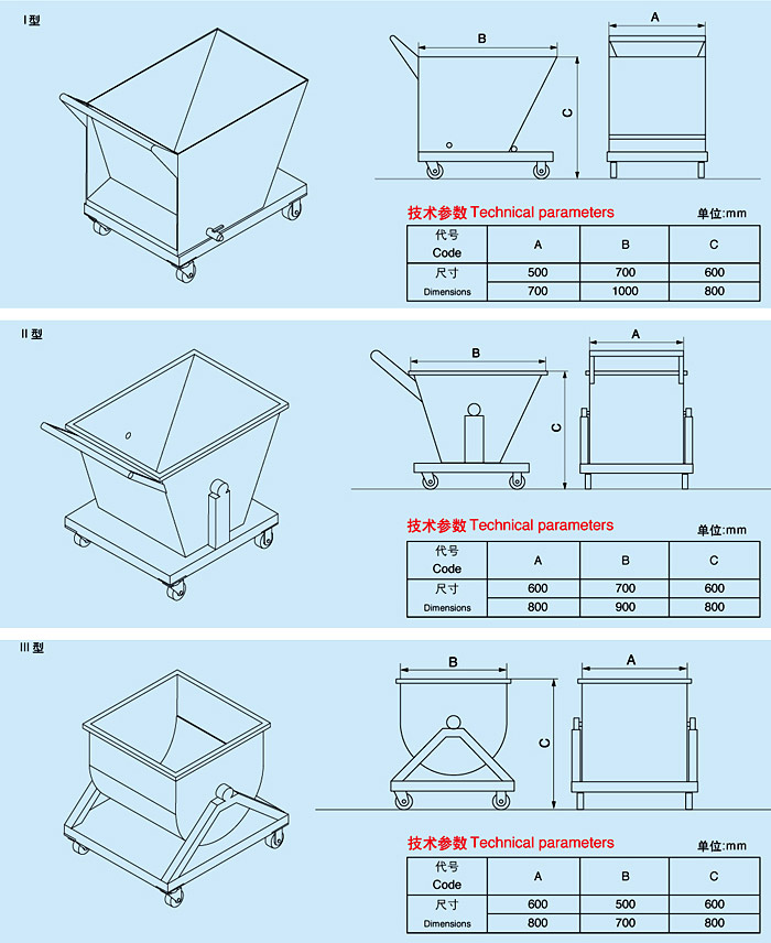 ●JXC 型集屑車(料斗)用于收集各種機床排屑裝置傳送下來的各種切屑,集屑車(料斗)底部裝有腳輪,可將切屑送出工作場地,便于集中清理。集屑車(料斗)分為干式與濕式兩種,干式料斗可以傾斜,將切屑倒出即可,濕式是在干式基礎上加過濾板,放液閥,便于切屑中的切屑液與切屑分離起到回收環保作用。可根據不同排屑量,不同用戶的要求.設計各種容積、功能的集屑車(料斗)。